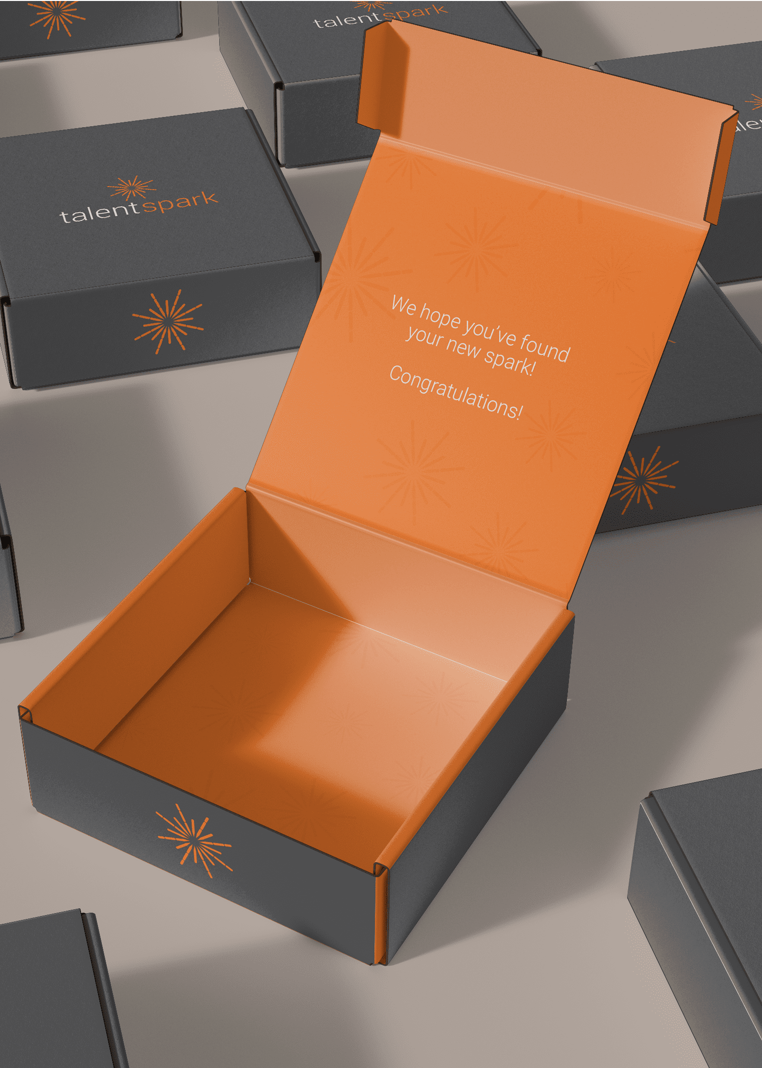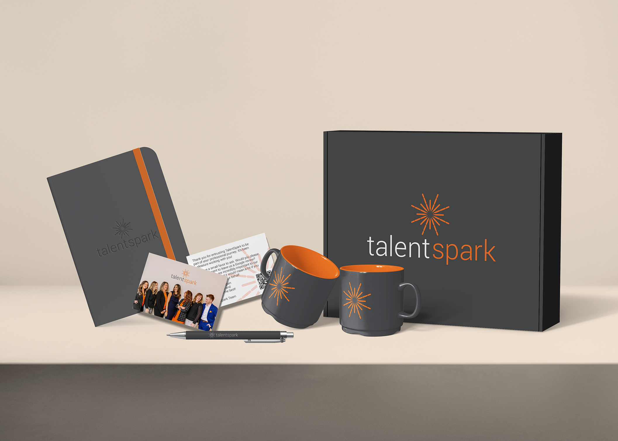 The final kit includes a 16oz coffee mug in TalentSpark’s signature brand color, a debossed spiral-bound notebook, a soft-touch metal pen, and a personalized thank-you note—all packaged in a box welcoming them to their new spark. Now, all TalentSpark has to do is notify us when they place a candidate, and we handle the rest.